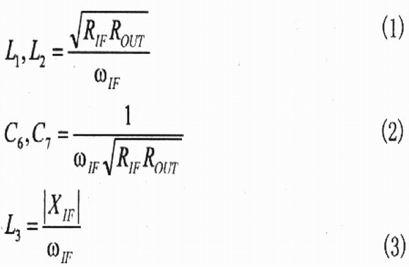 在許多應用中,可以用離散IF不平衡變壓器代替IF變壓器,如圖4所示。Ll、L2、C6和C7的值可用式(1)、式(2)計算,在IF頻率期望值上得到 180°相移,并提供50Ω的單端輸出。電感器L3的值也可計算,但L3抵消內(nèi)部2.5pF的電容器,L3也為IF+端提供偏置電壓。低功耗多層片式電感適合Ll、L2,為了得到最大轉換增益以及為IF+端提供最小DC電壓,L3選用高Q值線繞片式電感器,C3是DC的隔離電容器。
