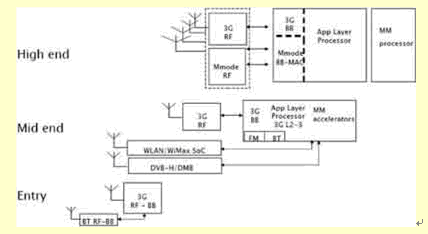 隨著多種無(wú)線(xiàn)技術(shù)標(biāo)準(zhǔn)在便攜無(wú)線(xiàn)設(shè)備中獲得應(yīng)用,客觀上要求便攜式無(wú)線(xiàn)設(shè)備以有成本效益的方式支持多個(gè)頻段以及多種不同的調(diào)制方式。業(yè)內(nèi)專(zhuān)家認(rèn)為[1],目前多種無(wú)線(xiàn)標(biāo)準(zhǔn)在便攜式無(wú)線(xiàn)設(shè)備中的聚合將遵循入門(mén)級(jí)、中檔和高檔三種技術(shù)方案(圖1),采用CMOS數(shù)字無(wú)線(xiàn)電技術(shù)和可配置無(wú)線(xiàn)電技術(shù)是將來(lái)最終的解決方案。