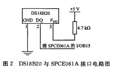 溫度檢測單元采用D1S8B02型傳感器,是美國DALLAS公司推出的一種改進(jìn)型智能溫度傳感器,與傳統(tǒng)的熱敏電阻等測溫元件相比,它能直接讀出被測溫度,并且可根據(jù)實際要求通過編程實現(xiàn)9~12位的數(shù)字值讀數(shù)方式。DS18BZo與SPCEo61A單片機(jī)的接口電路如圖2所示,由于DS18B20傳感器支持“一線總線”接口,因此只需將DS18B20信號線接到單片機(jī)的1位1/0線上即可,而且在1根1/0線上可以掛接多個傳感器實現(xiàn)多點(diǎn)溫度測量。