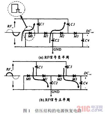 倍壓結(jié)構(gòu)的電源恢復(fù)電路如圖1所示。圖中的二極管在實(shí)際應(yīng)用時通常用MOS管替代。輸入正弦交流信號RFin=VAsint。在RFin負(fù)半周期時,M0導(dǎo)通,C1充電。C1兩端能夠獲得的最大電壓為VA-Vd,其中,Vd為MOS管M0兩端的電壓降。