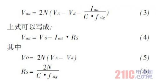 RFin正半周期時,節(jié)點(diǎn)1的最大電壓為VA+(VA-Vd)。該電壓使得M1導(dǎo)通,C2充電,直到C2兩端達(dá)到最大電壓,即節(jié)點(diǎn)2的最大電壓,為VA+(VA- Vd)-Vd=2(VA-Vd)。依次類推,C3兩端能夠獲得的最大電壓為3(VA-Vd),節(jié)點(diǎn)4的最大電壓為4(VA-Vd)。節(jié)點(diǎn)2N的最大電壓為 2N(VA-Vd)。于是,對于2N級電路,輸出直流電壓為: