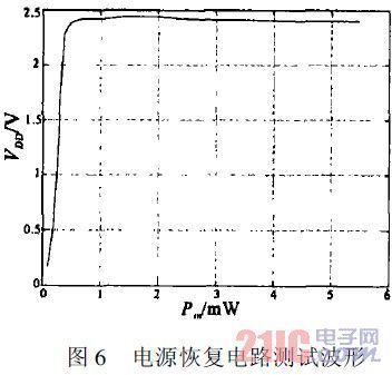 根據(jù)芯片測試結(jié)果,該射頻接口電路能夠在讀寫器4W等效發(fā)射功率下距讀寫器4m處為射頻標(biāo)簽芯片提供足夠的工作電壓,并且在芯片近場時能夠有效地穩(wěn)定電源電壓。解調(diào)信號基本正常可用。因此,該射頻接口電路可滿足超高頻遠(yuǎn)距離無源射頻標(biāo)簽芯片的要求,具有實(shí)用意義。
