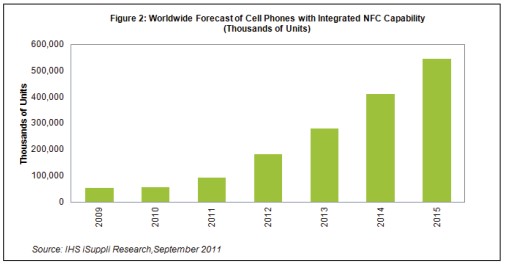 據(jù)IHS iSuppli公司的移動(dòng)與無(wú)線通信研究報(bào)告,由于市場(chǎng)對(duì)移動(dòng)電子支付和其它應(yīng)用的需求旺盛,2015年采用近距離通信(NFC)技術(shù)的手機(jī)出貨量將是是2010年5620萬(wàn)部的10倍,達(dá)到5.447億部。