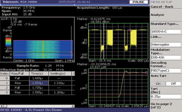 預(yù)編程測量能減少進(jìn)行這些測試所需的建立時間。例如,ISO18000-6 C 類型的一個重要測量是啟動時間和關(guān)閉時間。載波能量上升時間必須足夠快以保證標(biāo)簽采集到使其正常工作的充足能量。信號也必須迅速達(dá)到穩(wěn)定狀態(tài)。發(fā)射結(jié)束時,載波能量下降時間必須足夠快,以防止其他發(fā)射受到干擾 [參閱圖3]。