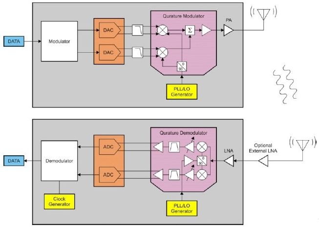 典型的低功耗無線鏈路由一個發(fā)送器件和一個或多個接收器件組成。發(fā)送器件由一個調(diào)制器、合成器、升頻混頻器和一個功率放大器(PA)組成。接收機(jī)由互逆器件、低噪聲放大器(LNA)、降頻混頻器、合成器和解調(diào)器組成。