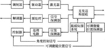 隨著通信技術(shù)的發(fā)展,對FSO系統(tǒng)的傳輸速率和距離均提出了更高的要求,如果要提高這兩個技術(shù)指標,就必須要增大激光器的發(fā)射功率和提高接收機的靈敏度,但擴束法和多束法對性能指標的改善有限,于是動態(tài)跟蹤法就應(yīng)運而生,即利用伺服系統(tǒng)通過反饋裝置獲得光束偏差信息,調(diào)整可調(diào)微鏡,使光束時刻對準接收器。采用動態(tài)跟蹤技術(shù)的FSO系統(tǒng)設(shè)備功能結(jié)構(gòu)如圖3所示,一般采用雙反饋方式,外反饋是位置探測器輸出的入射激光束的位置誤差信號,內(nèi)反饋是伺服系統(tǒng)控制的可調(diào)微鏡的位置信號,入射激光束通過接收光學(xué)系統(tǒng)后,聚集到位置探測器上,位置探測器將激光束的位置誤差信號輸出到主處理器。同時可調(diào)微鏡位置探測器將探測到的微鏡位置信號送到控制處理器中,控制處理器利用優(yōu)化的跟蹤算法進行計算,輸出的角度控制信號控制伺服系統(tǒng)調(diào)整可調(diào)微鏡,使接收光學(xué)系統(tǒng)始終對準入射激光束。