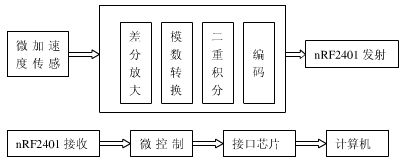 鼠標(biāo)在人的操縱下移動,微加速度傳感器便會實時地輸出鼠標(biāo)運動的加速度大小和方向,ADXL203傳感器的量程為±1.7gn ,電壓靈敏度為1000mV/gn,這個電壓信號經(jīng)過差分放大5.0/1.7倍后,通過微控制器A/D轉(zhuǎn)換功能變成與加速度大小對應(yīng)的數(shù)字信號,加速度經(jīng)過兩次積分,便變成了鼠標(biāo)移動的位移信號,然后,再經(jīng)過編碼,并通過nRF2401射頻收發(fā)器將位移信號發(fā)射出去。