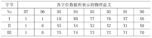 編碼的目的是將X和Y方向的位移改變量,連同鼠標(biāo)按鍵的實時信息,按照標(biāo)準(zhǔn)的Microsoft鼠標(biāo)協(xié)議要求的格式進(jìn)行編碼,以便最后發(fā)送到主機(jī)的信息能夠被電腦正確識別,從而使電腦能正確處理發(fā)送給它的位移信號,來正確控制鼠標(biāo)光標(biāo)的移動等動作。表1表示的即是標(biāo)準(zhǔn)的鼠標(biāo)協(xié)議規(guī)定的三字節(jié)數(shù)據(jù)包格式,第1個字節(jié)記錄的是左右按鍵的信息和鼠標(biāo)X,Y位移的最高2個字位的數(shù)據(jù),按鍵按下時,對應(yīng)的位置1,否則,置0;第2和第3個字節(jié)分別記錄X和Y方向位移的低6位數(shù)據(jù)。位移值的范圍取-127~+127,再大的位移改變量會自動溢出。