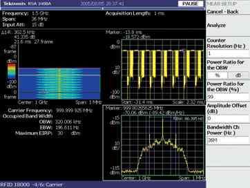 政府規(guī)定要求控制發(fā)射信號的功率、頻率、帶寬。這些規(guī)定防止有害干擾并保證每個發(fā)射者都是頻帶內(nèi)其他用戶的友好鄰居。對于許多頻譜分析儀特別是通常用于脈沖信號能量測量的掃頻頻譜分析儀,進行此類測量是具有挑戰(zhàn)性的。RTSA 能夠分析一個完整的分組發(fā)射過程的能量特點,也能直接測量跳頻信號的載波頻率,而無需將信號置于一個跨度的中心。按一下按鍵,分析儀就能識別一個瞬時 RFID 信號的調(diào)制方式并能夠?qū)β?、頻率和帶寬進行監(jiān)管測量,使預一致性(pre-compliance)測試過程變得非常靈活和方便 [參閱圖2]。預一致性測試有助于確保產(chǎn)品一次通過一致性測試,而無需重新設計和重新測試。