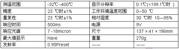 紅外測溫儀是通過接收目標物體發(fā)射、反射和傳導的能量來測量其表面溫度。測溫儀內的探測元件將采集的能量信息輸送到微處理器中進行處理,然后轉換成溫度讀數(shù)顯示。在帶激光瞄準器的型號中,激光瞄準器只做瞄準使用。其性能說明下表。