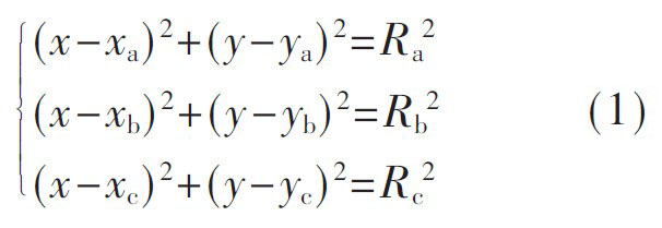 如圖3 所示, 在游戲場(chǎng)館C 區(qū)內(nèi), 設(shè)編號(hào)分別為a 、b 、c 的三個(gè)有源讀寫器的位置為(xa,ya) , (xb,yb) , (xc,yc) ,游客的位置坐標(biāo)(x,y), 三個(gè)讀卡器到游客的距離分別為Ra、Rb、Rc, 由時(shí)間信息定位方法(TOA) 可得式(1) , 即可求解游客的位置坐標(biāo)(x,y)。