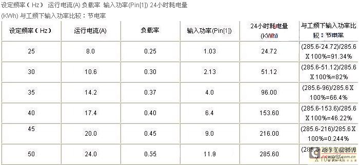 針對(duì)這一特殊要求制定方案,對(duì)其中兩臺(tái)對(duì)開電機(jī)進(jìn)行開環(huán)變頻調(diào)速控制,配合兩臺(tái)全速風(fēng)機(jī),即滿足不同材料的溫控要求,又能節(jié)約電能。按照這一方案進(jìn)行改造后,節(jié)電效果非常明顯。針對(duì)其中一種材料需固定頻率控制進(jìn)行冷卻,幾個(gè)月才換一次,設(shè)定頻率在25—35之間,完全滿足冷卻要求。工頻下運(yùn)行時(shí)一臺(tái)18.5KW風(fēng)機(jī)(經(jīng)變頻器輸出),每小時(shí)耗電為11.9度/小時(shí),日耗電量為:285.6度/24小時(shí)。在正常運(yùn)行時(shí)根據(jù)不同材料的溫度要求,設(shè)定頻率分別為:25Hz、30 Hz、35 Hz、40 Hz和45 Hz。運(yùn)行測(cè)定參數(shù)如下: