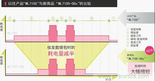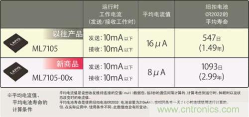 LAPIS Semiconductor去年推出的“ML7105”,實現(xiàn)了業(yè)界頂級的低耗電量(收發(fā)數(shù)據(jù)包時的運行狀態(tài))。此次開發(fā)出的新品“ML7105-00x”,不僅保持了運行狀態(tài)下的低耗電量性能,而且平均電流還減少了一半。所謂平均電流,是指按一定間隔反復(fù)收發(fā)數(shù)據(jù)包時的運行狀態(tài)(耗電量大)與休眠狀態(tài)(耗電量小)的平均電流值。通過大幅減少改變狀態(tài)所需的時間,使平均電流減半,從而使電池壽命可達2倍。因此,按LAPIS Semiconductor的工況條件,支持Bluetooth® Low Energy的、使用紐扣電池(CR2032)的設(shè)備其電池壽命即使在24小時連續(xù)工作的條件下,也可充分使用2年。