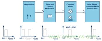 Tx鏈具有與Rx鏈相同的要求:需要高采樣速率以簡化濾波器設計,使信號頻率位于高中頻或直接變?yōu)樯漕l,以及遠遠地推開鏡像,但接口希望使用較低的數(shù)據(jù)速率。轉(zhuǎn)換器的集成DUC將解決這些要求。圖3是典型DUC的框圖。
