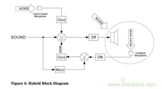 既然兩種方案各有利弊,那么把它們結(jié)合起來如何?這就是混合模式的有源噪聲消除,既使用前饋又使用反饋,系統(tǒng)設(shè)計得當(dāng)?shù)脑捒梢該P長避短,即避免風(fēng)噪又能抵消高頻噪聲。