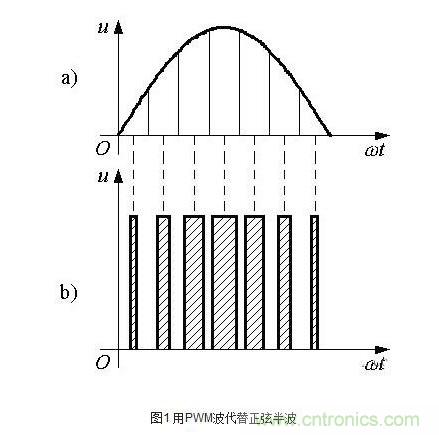 如圖1 所示,用一系列等幅不等寬的脈沖來代替一個(gè)正弦半波,正弦半波N 等分,看成N 個(gè)相連的脈沖序列,寬度相等,但幅值不等;用矩形脈沖代替,等幅,不等寬,中點(diǎn)重合,面積(沖量)相等,寬度按正弦規(guī)律變化。