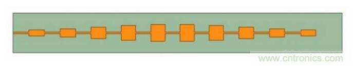 在串饋微帶貼片陣列中,每個貼片天線的寬度正比于貼片天線等效導(dǎo)納,而等效導(dǎo)納又正比于該貼片的激勵功率;因此通過并調(diào)節(jié)線陣中每個貼片的寬度,可以改變該天線的激勵功率,從而實現(xiàn)線陣激勵的錐削分布,滿足防撞雷達天線在俯仰面對于低副瓣的要求。