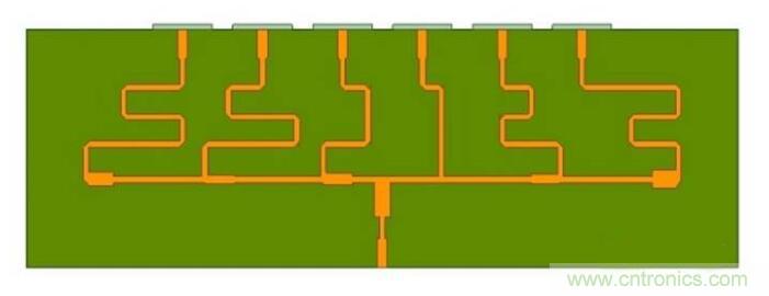 3.2節(jié)確定了各線陣激勵的幅相值,但圖8里的仿真方向圖是理想的,現(xiàn)實中需要通過1分6的功分網(wǎng)絡(luò)來將其實現(xiàn)。常用的功分器有Wilkinson功分器和T型節(jié)功分器;Wilkinson功分器只能組成并饋網(wǎng)絡(luò),這種網(wǎng)絡(luò)具有較大的損耗且占用面積大,不利于小型化;而由T型節(jié)組成的串饋功分網(wǎng)絡(luò)具有損耗低占用面積小的優(yōu)勢,更適合于實現(xiàn)3.2節(jié)中波束賦形的幅相激勵。