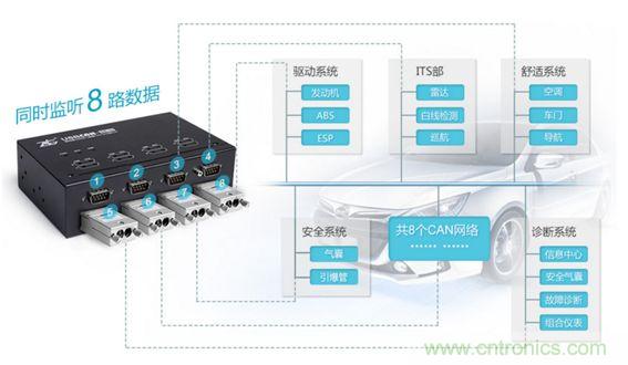 若將每個節(jié)點單獨取出做測試,則必然破壞原有通信規(guī)則。如何在不破壞原有通信的基礎(chǔ)上搞清楚一個陌生的收發(fā)協(xié)議呢?所謂工欲善其事,必先利其器。您需要一個能同時收發(fā)、轉(zhuǎn)送多路CAN數(shù)據(jù)的CAN卡,USBCAN-8E-U正是為這種應(yīng)用而生。