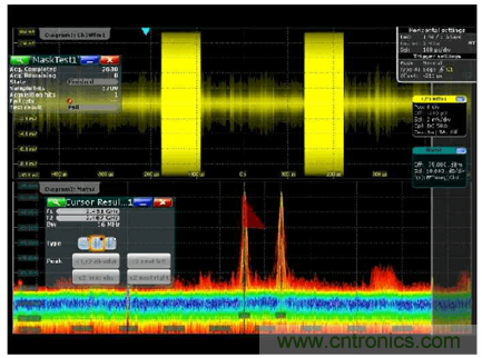 很多用慣了示波器的人都喜歡示波器的觸發(fā)功能,用各種觸發(fā)方式來(lái)隔離各種事件,穩(wěn)定顯示,觀察異常。在傳統(tǒng)頻譜儀上是很難實(shí)現(xiàn)觸發(fā)的,但是當(dāng)我們發(fā)現(xiàn)示波器的模板觸發(fā)方式,很容做到,把時(shí)域波形的實(shí)時(shí)頻譜變到頻域來(lái)觀察,借助MASK 測(cè)試的一些小工具,居然輕松設(shè)置和輕松觸發(fā)。因?yàn)槟0宓男螤钭杂删庉?,觸發(fā)的動(dòng)作自由組合,這樣的波形分析已經(jīng)完全跨越的時(shí)域和頻域的使用習(xí)慣,完全融合了時(shí)域和頻域?qū)π盘?hào)的思維方法了。