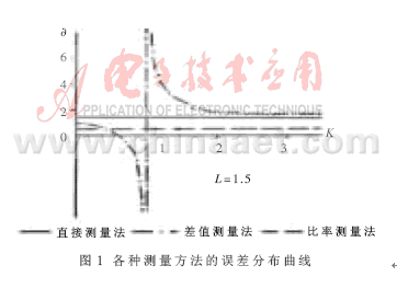圖1表示取L=1.5時(shí)相對誤差隨元件值的分布情況??梢钥闯觯嚷蕼y量法在很寬的測量范圍內(nèi)均具有良好的抗干擾能力。當(dāng)存在多個影響因素或者在分析由上述方法組合成的測量裝置時(shí),可根據(jù)疊加原理按系統(tǒng)誤差的理論綜合評定其精度。