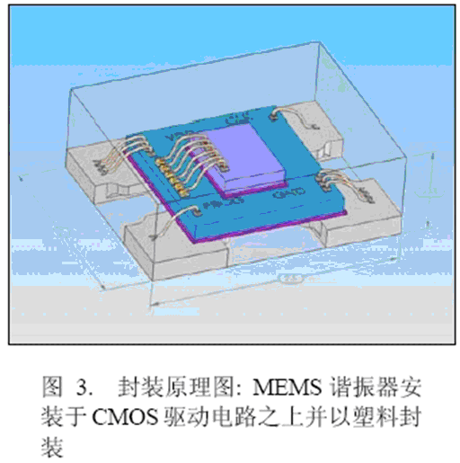 密封的諧振器經(jīng)過劃片,并以標(biāo)準(zhǔn)的注塑模具進行封裝。圖3給出了一種2.5×2.0×0.85mm塑料封裝的設(shè)計原理,即將MEMS諧振器安裝在CMOS驅(qū)動電路之上。這種封裝方法經(jīng)濟有效,是QFN/MLF技術(shù)的折衷考慮。它是振蕩器中的一種極小封裝,并且將來尺寸會更小。