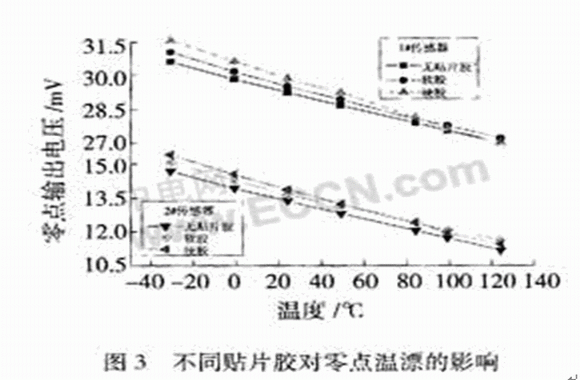 從圖3可以看出,貼片膠對傳感器零點的影響隨溫度變化而變化,在低溫時,使用了硬膠貼片的傳感器的零點明顯高于使用軟膠與無膠的,這種差別隨著溫度的升高變得越來越小。這主要有三個原因:①貼片膠的彈性模量隨溫度的升高而變小;②貼片膠高溫固化,在低溫時會引起收縮殘余應(yīng)力;③貼片膠和芯片材料熱膨脹系數(shù)不同產(chǎn)生的熱應(yīng)力。特別需要注意的是,在85℃之后,硬膠的影響突然變小,小到幾乎與無膠的情況相同。這是因為硬膠的玻璃化溫度(Tg)為85℃,高于Tg點時膠的楊氏模量變小,因而對傳感器的零點溫漂影響變小。因此,在選用貼片膠時,要求膠的Tg大于傳感器的工作溫度,以確保傳感器零點的穩(wěn)定性和工作的可靠性。