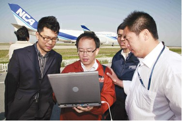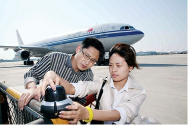 圖4:在浦東機場測試3G信號,電信工作人員仔細(xì)核對