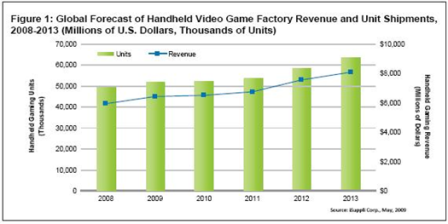 掌上型游戲控制臺(tái)的出貨量預(yù)計(jì)將從2008年的4940萬臺(tái)上升到2013年的6350萬臺(tái),預(yù)測期間的復(fù)合年增長率為5.2% (CAGR)。估計(jì)營收將以6.4%的CAGR增長,從2008年的59億美元上升至2013年的81億美元。