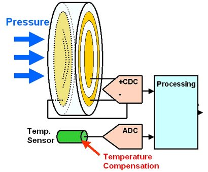 由于熱擴散,溫度傳感器需要考慮改變的幾何形狀。設想兩個電極中的一個附著在芯片上,另一個附著在由金屬或陶瓷構成的支架上,因此支架自己作為傳感器。以陶瓷為例,能夠承受非常高的壓力和侵入的媒介。與經(jīng)典的惠斯通電橋相比較,電容壓力傳感器的主要優(yōu)點是對輸入電流的要求更低,使得他們特別適合于諸如輪胎壓力控制之類的應用。