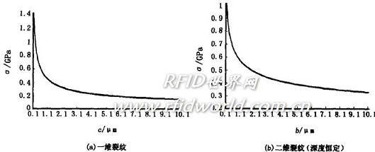 對(duì)于碎裂面垂直于芯片表面,深a、長(zhǎng)2b的二維半橢圓型裂紋而言,則滿足Ccr=[(Φ2KIC2)/(1。2πσIC2)][2],其中Ccr=(acrbcr)1/2,acr為臨界裂紋深度,bcr為臨界裂紋半長(zhǎng);裂紋幾何因子Φ=(1。2π)1/2/Y。設(shè)裂紋長(zhǎng)為2b,深度恒定為1μm,代入斷裂韌度KIC=0。82MPa,Y=1。42得,平面應(yīng)力狀態(tài)常載荷條件下碎裂的臨界強(qiáng)度σ=0。58/4b(GPa)可見,芯片碎裂臨界強(qiáng)度隨著微裂紋長(zhǎng)度的增大而急劇降低,當(dāng)裂紋大于1μm時(shí),下降趨勢(shì)逐漸平緩,并趨于穩(wěn)定小值?! ?br />