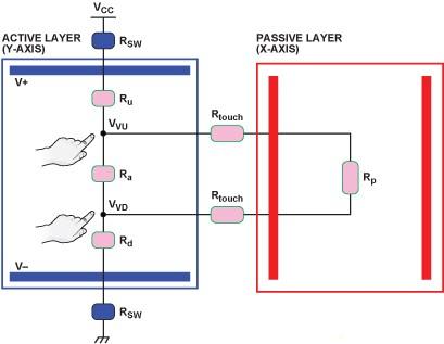 連接直流電壓的層稱為“有源”層,電流與其阻抗成反比。測(cè)量電壓的層稱為“無(wú)源”層,無(wú)相關(guān)電流流經(jīng)該層。發(fā)生單點(diǎn)觸摸時(shí),在有源層中形成一個(gè)分壓器,無(wú)源層電壓測(cè)量通過一個(gè)模數(shù)轉(zhuǎn)換器讀取與觸摸點(diǎn)和負(fù)電極之間的距離成比例的電壓1.