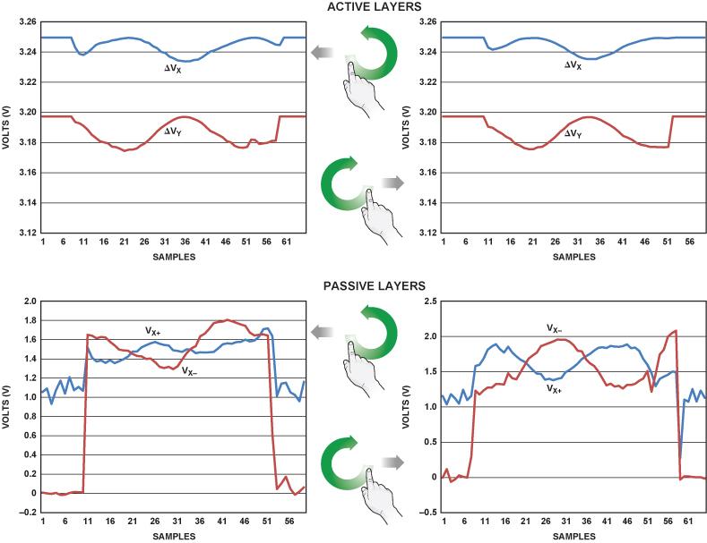 在后半周期中,將一個(gè)直流電壓施加于下層(有源層),并測(cè)量Y+引腳的電壓(對(duì)應(yīng)于VX+ – VX–),以提供與X方向上的運(yùn)動(dòng)(接近還是分開)相關(guān)的信息。