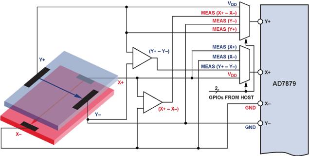 對(duì)于各種消費(fèi)、醫(yī)療、汽車和工業(yè)設(shè)備,增強(qiáng)的低成本觸控式用戶界面是一個(gè)極具價(jià)值的特性。在許多消費(fèi)電子應(yīng)用中,設(shè)計(jì)師偏向使用容性觸摸屏,而不愿使用阻性觸摸技術(shù),原因是前者可以跟蹤手指,似乎能夠提供更友好的用戶交互體驗(yàn)。目前,低成本阻性技術(shù)的應(yīng)用市場(chǎng)包括:只需要單點(diǎn)觸控、至關(guān)重要的極其精確的空間分辨率、利用觸控筆來(lái)實(shí)現(xiàn)特定功能(如亞洲語(yǔ)言符號(hào)識(shí)別等),或者用戶必須戴手套的場(chǎng)合。 雖然阻性技術(shù)傳統(tǒng)上是用來(lái)檢測(cè)屏幕上“單點(diǎn)觸摸”的位置,但本文提出了一個(gè)創(chuàng)新的“兩點(diǎn)觸摸”概念,它利用阻性觸摸屏控制器 AD7879 在廉價(jià)的阻性觸摸屏上檢測(cè)最常見的雙指手勢(shì)(縮放、捏合和旋轉(zhuǎn))。