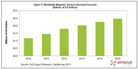 預計今年硅磁傳感器銷售額將達到14.6億美元。2010年該市場大增48.6%,達到11.8億美元。鑒于乘用車產(chǎn)業(yè)強勁復蘇,以及羅盤在手機和平板電腦中得到更多應用,未來幾年磁傳感器市場前景相當樂觀。