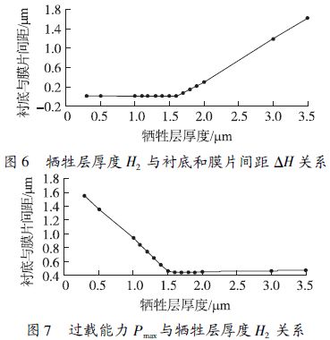 由圖7 可見,犧牲層厚度H2小于1.6 μm 時,由于彈性膜片在斷裂前受到襯底的支撐,傳感器的過載能力隨犧牲層厚度的減小得到顯著提高。