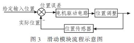 如圖3滑動模塊流程示意圖所示,本系統(tǒng)方案設(shè)計在傳輸系統(tǒng)和SMT生產(chǎn)設(shè)備的連接處,增設(shè)一個滑動裝置,主要由滑動板、滾珠和位置傳感器組成,形成了一個閉環(huán)控制,起到平衡作用。在生產(chǎn)過程中,由模塊裝置上的位置傳感器實時將實際位置信號反饋給系統(tǒng),與給定輸入位置信號相比較產(chǎn)生一個位置誤差信號,然后由這個誤差信號驅(qū)動電機運轉(zhuǎn)進行位置調(diào)整。當(dāng)設(shè)備平衡時,位置誤差為零,不進行位置調(diào)整;當(dāng)傳輸機有偏斜時,位置誤差不為零,由它驅(qū)動電機運轉(zhuǎn),使設(shè)備進行一定的位置調(diào)整。通過這套裝置,消除由振動產(chǎn)生位置偏移、利于整個生產(chǎn)線的生產(chǎn)、增強各設(shè)備之間銜接。