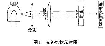 系統(tǒng)要求光電傳感探測(cè)部分具有較高的檢測(cè)精度和穩(wěn)定性,且實(shí)時(shí)性高,即需要對(duì)待測(cè)海水進(jìn)行連續(xù)不間斷的在線測(cè)量,因此采用近紅外LED作為光源。光源發(fā)出的近紅外光經(jīng)過(guò)光學(xué)鏡組選擇得到對(duì)溢油具有特征吸收的分析光,經(jīng)透射與樣品室的樣品發(fā)生相互作用,然后進(jìn)入光電探測(cè)器,將光信號(hào)轉(zhuǎn)換為電信號(hào),從而實(shí)現(xiàn)對(duì)樣品成分的檢測(cè)見(jiàn)圖1所示。
