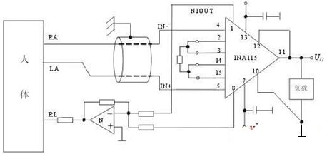 圖1是INA115在心電檢測(cè)電路中的實(shí)用電路。放大器的正負(fù)輸入通過(guò)心電傳感器分別接到人體的左臂(LA)與右臂(RA)上,與運(yùn)放N和電阻R1~R4組成的驅(qū)動(dòng)網(wǎng)絡(luò)接到人體的右腿(RL)上,構(gòu)成“浮地”。由于生物信號(hào)很弱,加之有極化電位,所以該級(jí)的放大倍數(shù)不宜太高,一般取在10~100之間,并且只能作為前置放大用,為了檢測(cè)安全,后級(jí)一般應(yīng)再采用隔離放大電路進(jìn)行隔離,且該級(jí)的電源電壓最好應(yīng)采用隔離電源模塊進(jìn)行提供,以達(dá)到電源及信號(hào)的完全隔離。如圖2所示,