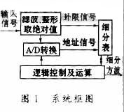 細(xì)分主要由以下幾個(gè)部分構(gòu)成,取絕對值、提取卦限信號(hào)、A/D轉(zhuǎn)換、查細(xì)分表、邏輯運(yùn)算等。系統(tǒng)框圖如圖1所示。