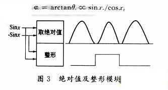 從原理上可以看出,該細(xì)分模塊的技術(shù)關(guān)鍵是比較器整形產(chǎn)生的卦限信號(hào)和A/D模塊產(chǎn)生的地址信號(hào)必須同步,這是能否正確細(xì)分的關(guān)鍵。因此,在電路設(shè)計(jì)過程中,比較器的滯后及其抗干擾能力是必須考慮和解決的問題。在抗干擾方面,采用差分放大,可以有效地抑制共模干擾。考慮其滯后問題,采用整形電路與取絕對值電路分離,可以通過調(diào)節(jié)各個(gè)運(yùn)放的直流參數(shù),使得卦限信號(hào)與絕對值信號(hào)能夠近似同步,否則,產(chǎn)生的細(xì)分方波將會(huì)在過零處變得混亂。如圖3所示,對其中sinx信號(hào)取絕對值及整形,這樣一來,既方便了調(diào)試,也避免了干擾及比較器的滯后問題。