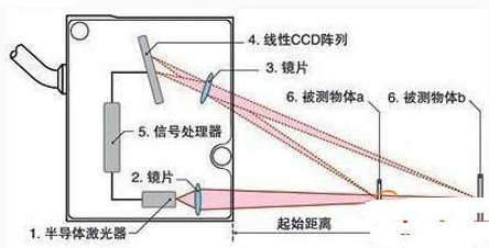 半導(dǎo)體激光器1被鏡片2聚焦到被測(cè)物體6。反射光被鏡片3收集,投射到CCD陣列4上;信號(hào)處理器5通過(guò)三角函數(shù)計(jì)算陣列4上的光點(diǎn)位置得到距物體的距離。