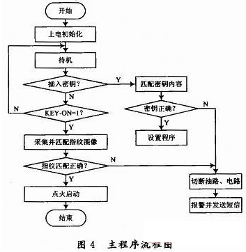 主要工作原理如下:車主停車熄火后,防盜器進入鎖定狀態(tài)。此時如果汽車鑰匙不在ON位,就不能進行指紋識別;只有當汽車鑰匙在ON位,才可用指紋識別解鎖防盜器并自動點火。在鎖定狀態(tài)下,汽車的油路、電路等被切斷,汽車鑰匙無法點火;如果強行剪斷指紋采集模塊和控制盒的連線,或者不識別指紋而強行用汽車鑰匙點火,汽車會通過鳴號、閃燈和無線通信網(wǎng)絡報警。在鎖定狀態(tài)插入密碼鑰匙可進入解鎖狀態(tài),并可根據(jù)LCD和語音提示通過小鍵盤進行指紋注冊/刪除、手機號碼設置和應急點火等操作。