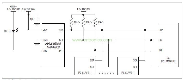 MAX44000設(shè)計用于驅(qū)動外部IR LED,工作在1.7V至3.6V VDD供電電源。只有環(huán)境光傳感器工作時,器件消耗5µA電流,使能接近檢測接收器和驅(qū)動器后,器件僅消耗7µA電流。