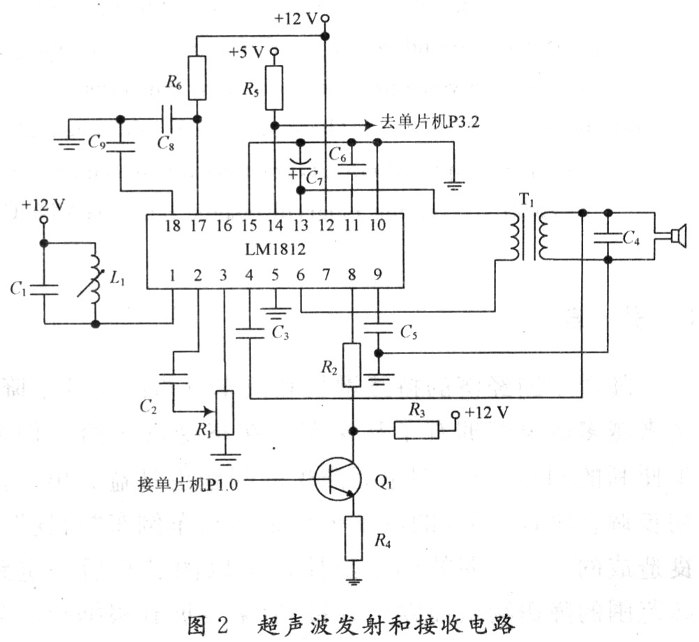 系統(tǒng)框圖如圖1所示。該系統(tǒng)由單片機控制電路、超聲波發(fā)射與接收電路、溫度補償電路、LCD顯示電路以及語音報警電路等幾部分組成。單片機AT89C51是整個系統(tǒng)的核心部件,協(xié)調(diào)各部分電路的工作。單片機在超聲波信號發(fā)射的同時開始計時,超聲波信號在空氣中傳播遇到障礙物后發(fā)生反射,反射的回波信號經(jīng)過處理后輸入到單片機的INTO端產(chǎn)生中斷,計數(shù)器停止計數(shù)。通過計數(shù)器測得的脈沖數(shù)可得到超聲波信號往返所需要的時間,從而達到測距的目的。超聲波探頭選用TCF40-25TR1型收發(fā)一體式超聲波傳感器,諧振頻率為40 kHz;超聲發(fā)射與接收電路采用LM1812專業(yè)集成電路,不僅外圍元件較少,電路簡單,而且有更好的穩(wěn)定性及可靠性;溫度補償電路采用一線制數(shù)字溫度傳感器DS18B20,利用聲速和溫度之間的關(guān)系對聲速進行校正,從而消除溫度對聲速的影響;語音報警電路采用ISD4004,可實現(xiàn)汽車倒車過程中的語音報警。