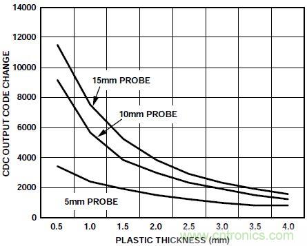 收集典型按鈕傳感器響應(yīng)數(shù)據(jù)采用10 mm × 10 mm的按鈕傳感器來(lái)實(shí)現(xiàn)。為了模擬用戶的手指,采用了各種尺寸的接地金屬探頭來(lái)激活按鈕。傳感器PCB位于厚度為0.5 mm至4 mm的塑料下方。傳感器響應(yīng)定義為傳感器接觸和未接觸狀態(tài)下CDC輸出代碼的變化。