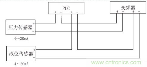 對于傳感器輸出的電流信號,只經PLC和變頻器的輸入阻抗之和不大于傳感器的輸出負載阻抗即可,壓力傳感器的信號可以同時串入PLC和變頻器,如只有壓力傳感器信號,則PLC和變頻器也都可以正常接收壓力傳感器的信號。而當液位傳感器的信號也同時接入PLC和變頻器時,因PLC接收信號的-端都在變頻器的+端,當兩傳感器的信號電流不一樣時,就有可能使PLC兩-端的電位有較大的差異,就就形成了共模干擾電壓。如PLC輸入端又互相不是隔離的,則會造成PLC的模擬信號輸入端接收不正常。變頻器的兩輸入信號是在PLC的后面,其-端電位可保持在變頻器內部電路設定的狀態(tài),問題不大。