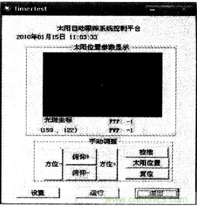 上位機(jī)可執(zhí)行程序控制界面如圖5所示,上位機(jī)控制平臺(tái)具有實(shí)現(xiàn)復(fù)位,太陽(yáng)位置的跟蹤、手動(dòng)校準(zhǔn)。其中“設(shè)置”按鈕,可進(jìn)行波特率、調(diào)整時(shí)間間隔等的設(shè)置。