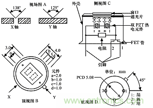 圖2:熱釋電紅外傳感器結構及內部電路