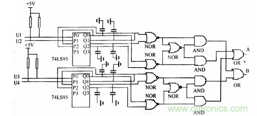 位移除了有大小的屬性外,還具有方向的屬性。為了辨別標(biāo)尺光柵位移的方向,僅靠一個(gè)光敏元件輸出一個(gè)信號(hào)是不行的。必須有2個(gè)以上的信號(hào)根據(jù)他們的相位不同來(lái)判斷位移方向。因此,本設(shè)計(jì)采用的是4個(gè)硅光電池來(lái)接收莫爾條紋信號(hào),則輸出的4路信號(hào)在相位上依次相差90°,利用這種特點(diǎn)設(shè)計(jì)的辨向電路的如圖3所示。圖中u1,u2和u3,u4分別通過(guò)相同的電路實(shí)現(xiàn)對(duì)位移方向的區(qū)別。當(dāng)莫爾條紋上移時(shí)(假設(shè)經(jīng)過(guò)硅光電池的前2個(gè),此時(shí)u1,u2有信號(hào),u3,u4無(wú)信號(hào)),則圖中A點(diǎn)有計(jì)數(shù)脈沖,B點(diǎn)為恒定電平;當(dāng)莫爾條紋下移時(shí)(假設(shè)經(jīng)過(guò)硅光電池的前2個(gè),此時(shí)u1,u2有信號(hào),u3,u4無(wú)信號(hào)),則圖中B點(diǎn)有計(jì)數(shù)脈沖,A點(diǎn)為恒定電平。用2個(gè)不同計(jì)數(shù)器分別記錄上移和下移所形成的脈沖數(shù),即可實(shí)現(xiàn)辨向。